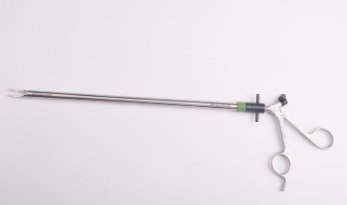 该产品是一种枪式施夹钳,由钳头、钳杆、旋转钮(转盘)、钳柄、支撑弹簧组成。钳体采用不锈钢材料制成;可旋转的转盘采用聚醚醚酮材料制成。产品非灭菌、用前需消毒、可重复使用。